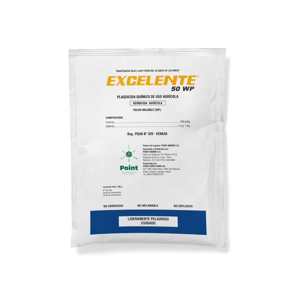 Excelente® 50 WP (Linuron) es un herbicida selectivo de emergencia y post emergencia temprana. Es absorbido principalmente por las raíces y transportado a las hojas y yema terminales una vez en ellas impide el proceso de la fotosíntesis, notándose esto en las puntas y bordes de las hojas, ya que se presenta una clorosis (amarillamiento) acentuado. La muerte sobreviene posteriormente.
